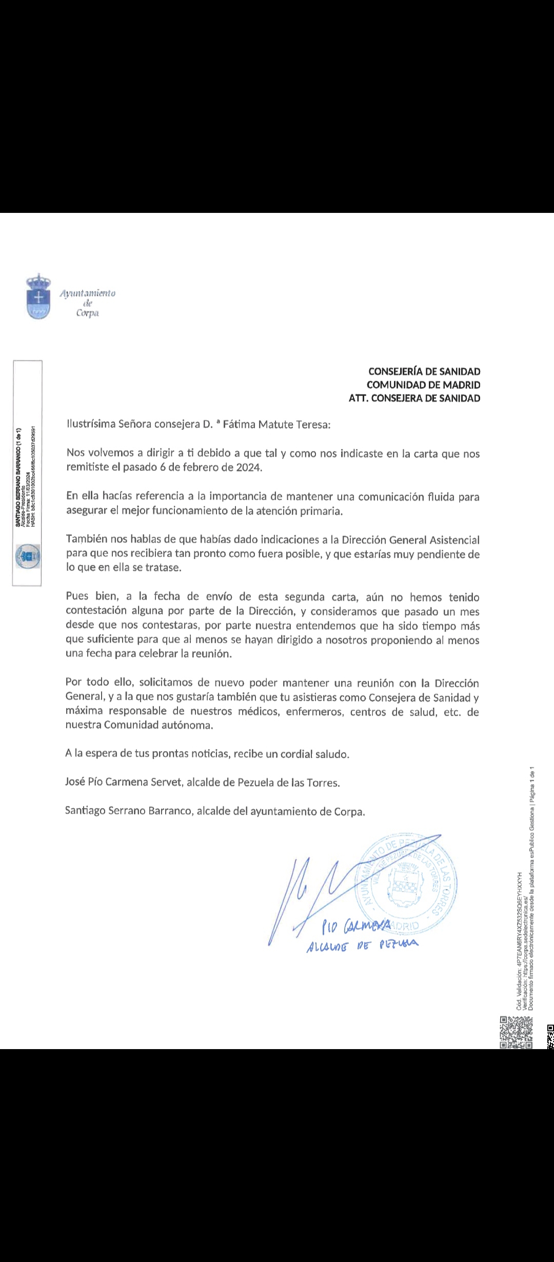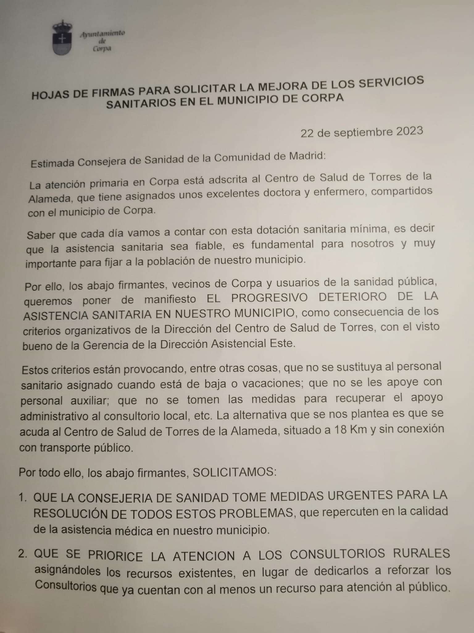 Ya están disponibles en el Ayuntamiento y en los diferentes establecimientos del municipio las hojas de recogida de firmas que serán presentadas en la Dirección Asistencial Este y en la Gerencia de la Comunidad de Madrid. En éstas se manifiesta el deterioro paulatino que Corpa y otros pueblos cercanos sufren en la atención sanitaria. Es por ésto por lo que se debe poner de manifiesto nuestro descontento como usuarios de la sanidad pública, y exigir(...)