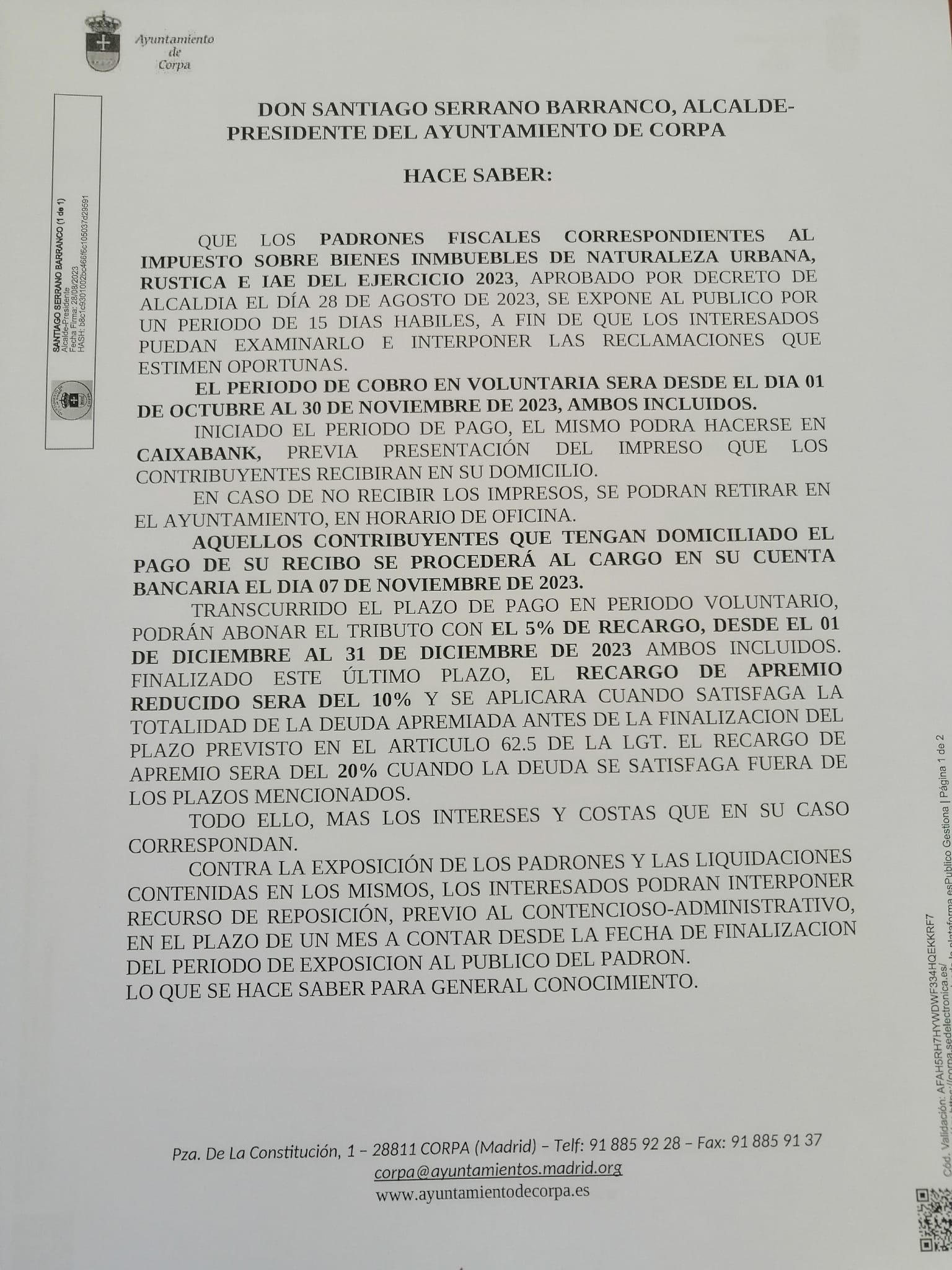 HORARIO DE ATENCIÓN AL PÚBLICO DEL AYUNTAMIENTO DE CORPA :